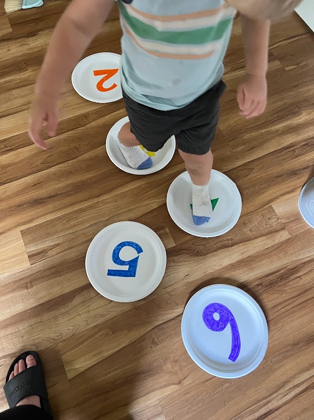 - Writing numbers on paper plates and taping them to the floor and asking him to step onto specific numbers