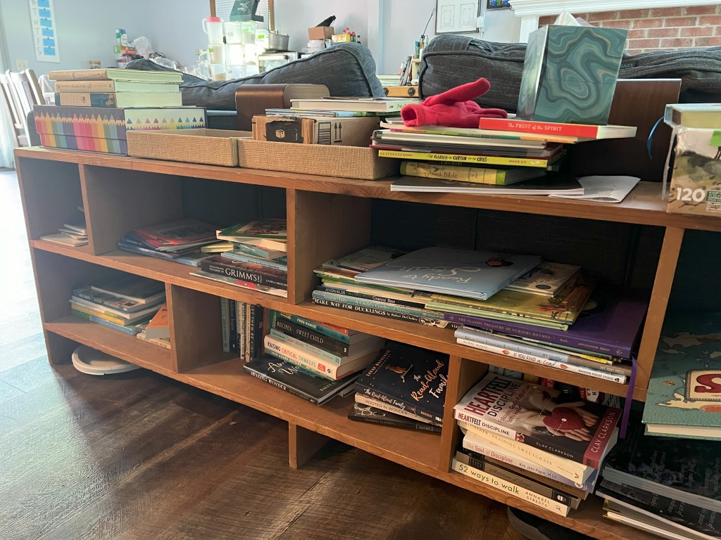I devour homeschool books. I treat learning about homeschooling as “honing my craft.” Here’s my secret: when I’m with my son, those are what I reach for. If he’s going to freeplay or we’re heading outside for a few hours, then I grab whatever homeschooling book I’m currently reading. Here’s why: I’m already in my homeschool mom headspace so it’s easy to jump into it and it’s easy to jump out of it. When he calls out, “mommy, come play with me,” or “watch this,” I’m already reading a book encouraging me to engage with him and prioritize our relationship over other things, so it’s easy to pause and think, this book can wait. These books live on the same shelf as all his homeschooling books! I keep my books on faith or self-growth on a side table where I spend our afternoon quiet time or in the playroom where we spend evening family time. We don’t allow anyone, adults included, to use screens in the playroom so my husband I both always have a book in hand in case our son wants to play alone or with the other parent in our time between dinner and bed. And I keep my entertainment books in my room where I read before bed. Some of these books are pretty twaddle-ish! And that’s okay. They have their place and when I keep my books grouped together with like-books it helps me know how to engage my brain in the moment. Again, it takes some of the thinking out of it but it also matches my reading energy to the spaces I’m in.