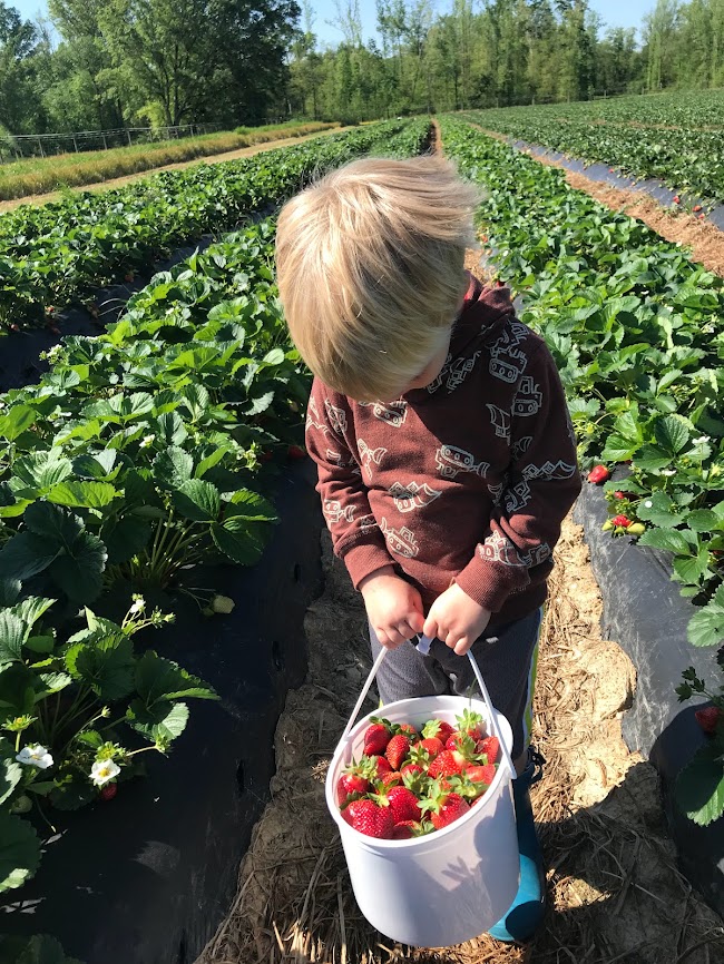 I had one of these experiences with my son today, at the local Strawberry Farm. Our first visit was two months after his first birthday, nearly two years ago, on my second Mother’s Day weekend. We were visiting, house-hunting, and a friend suggested we take a break and meet up there for a little strawberry fun. On that first trip my son wasn’t too interested in the berry picking, but he did enjoy the tractors and chickens and being outside. He also enjoyed trying his first ice cream and seeing others pick berries.